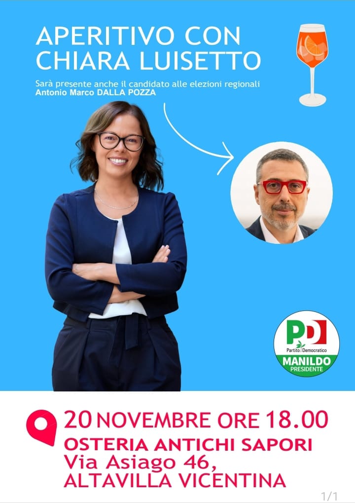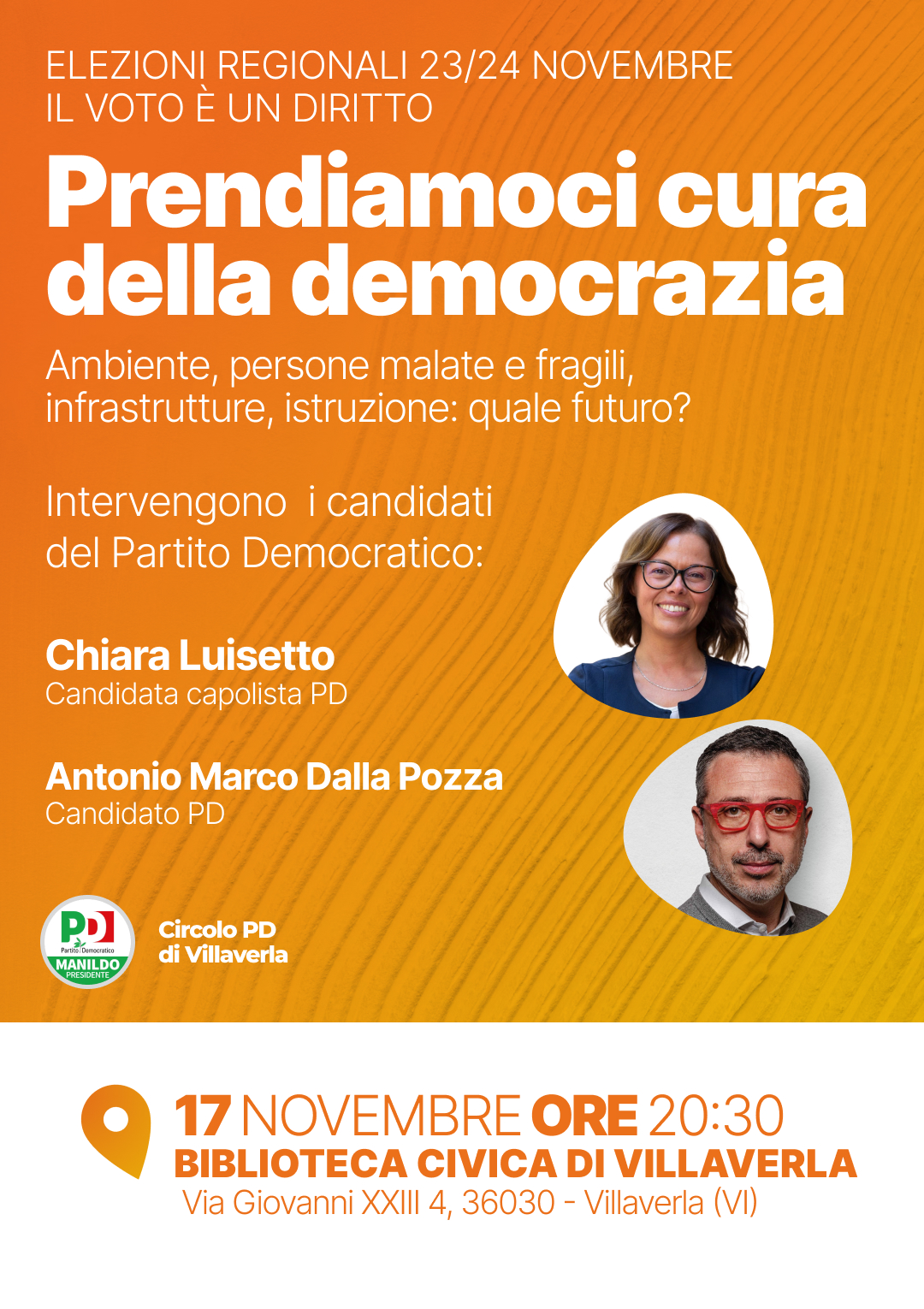 ELEZIONI REGIONALI 23/24 NOVEMBRE: IL VOTO È UN DIRITTO Ambiente, persone malate e fragili, infrastrutture, istruzione: quale futuro? Intervengono i candidati del Partito Democratico: Chiara Luisetto, consigliera regionale e candidata...